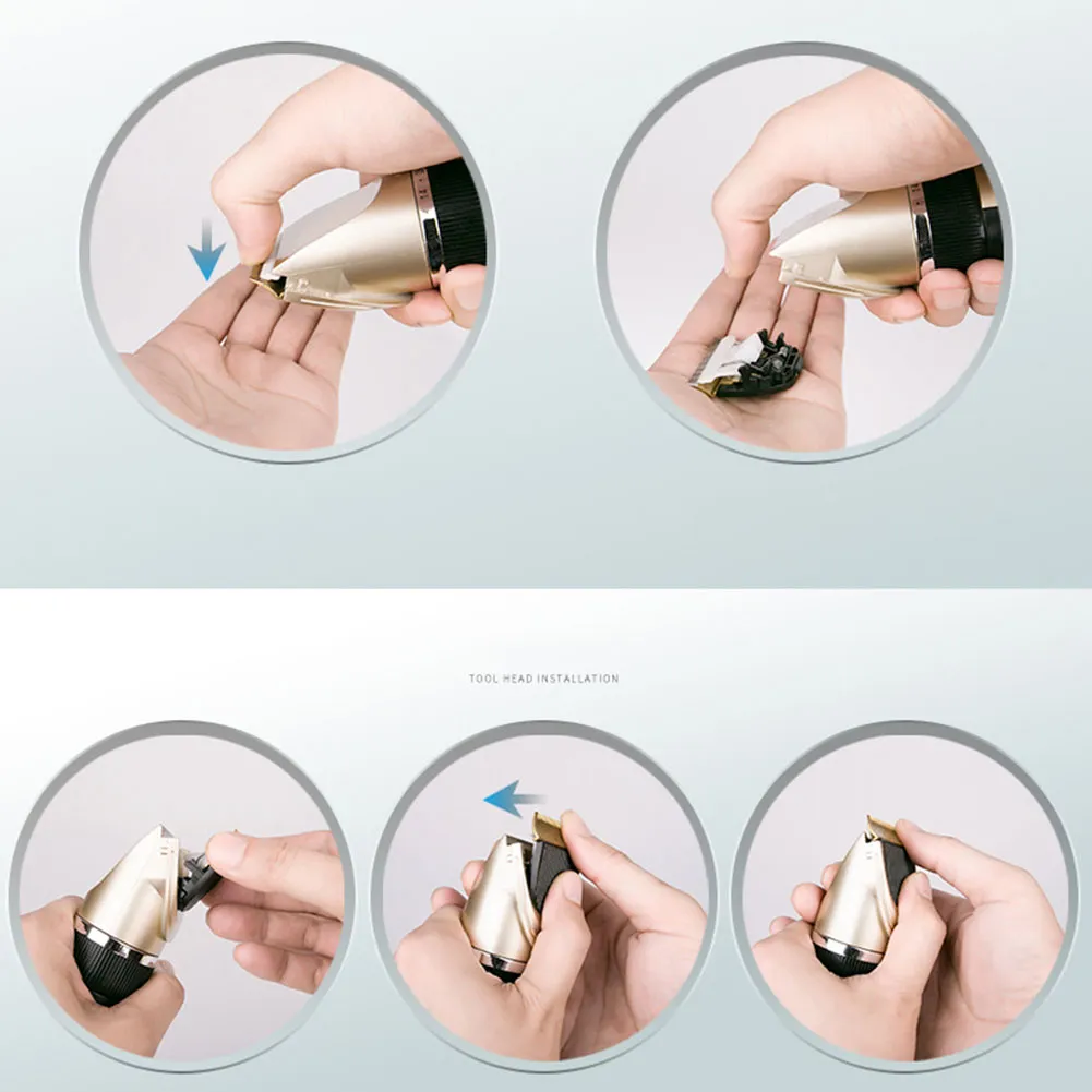 3. Five fine-tuning speeds + four limit combs: depending on the length of the hair, the cutting head or a limited comb configuration.