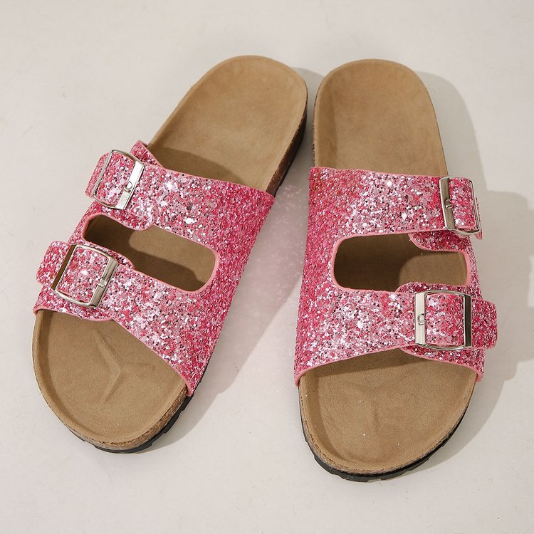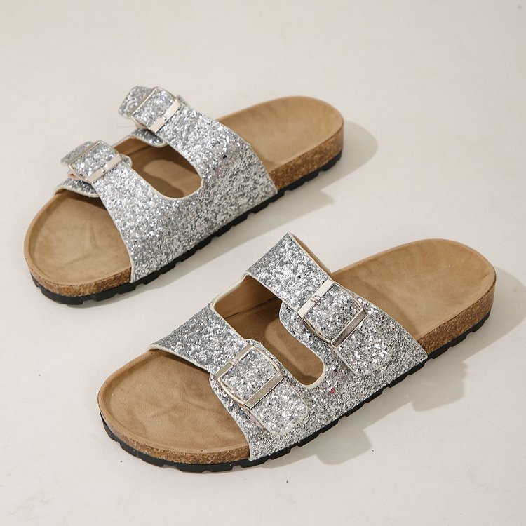 Double Buckle Sandals For Women New Fashion Sequined Beach Shoes Summer Leisure Outdoor Slippers Slides