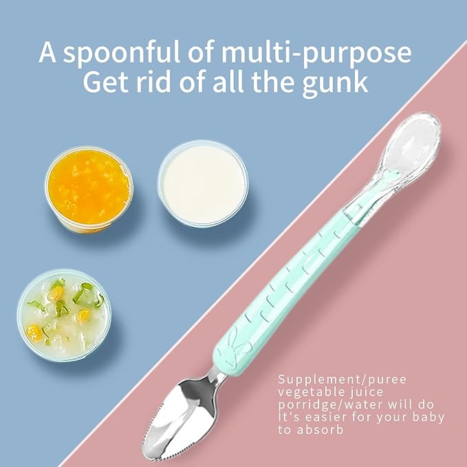 - Multifunctional Design: the baby food spoon is designed with double ends, including 1 soft silicone spoon head for baby food feeding and 1 stainless steel scraper head for fruit scraping, the zigzag scraper is smooth and safe to use for babies
