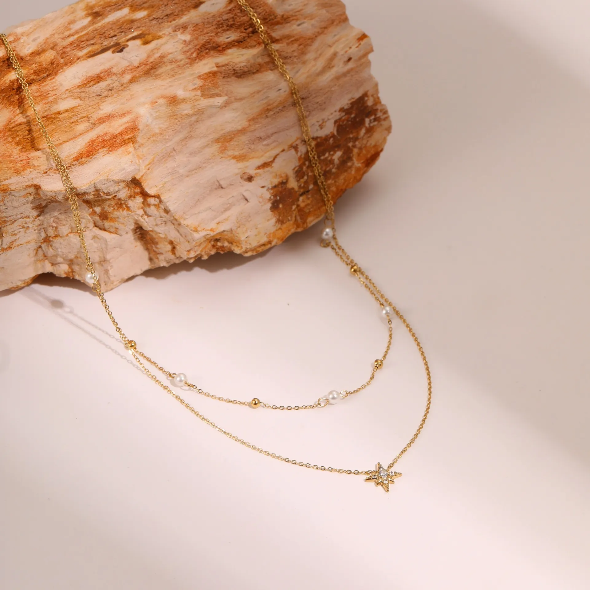 Double-layer Six-pointed Star Rhinestone Pearl Necklace – 18K Gold Plated INS Design