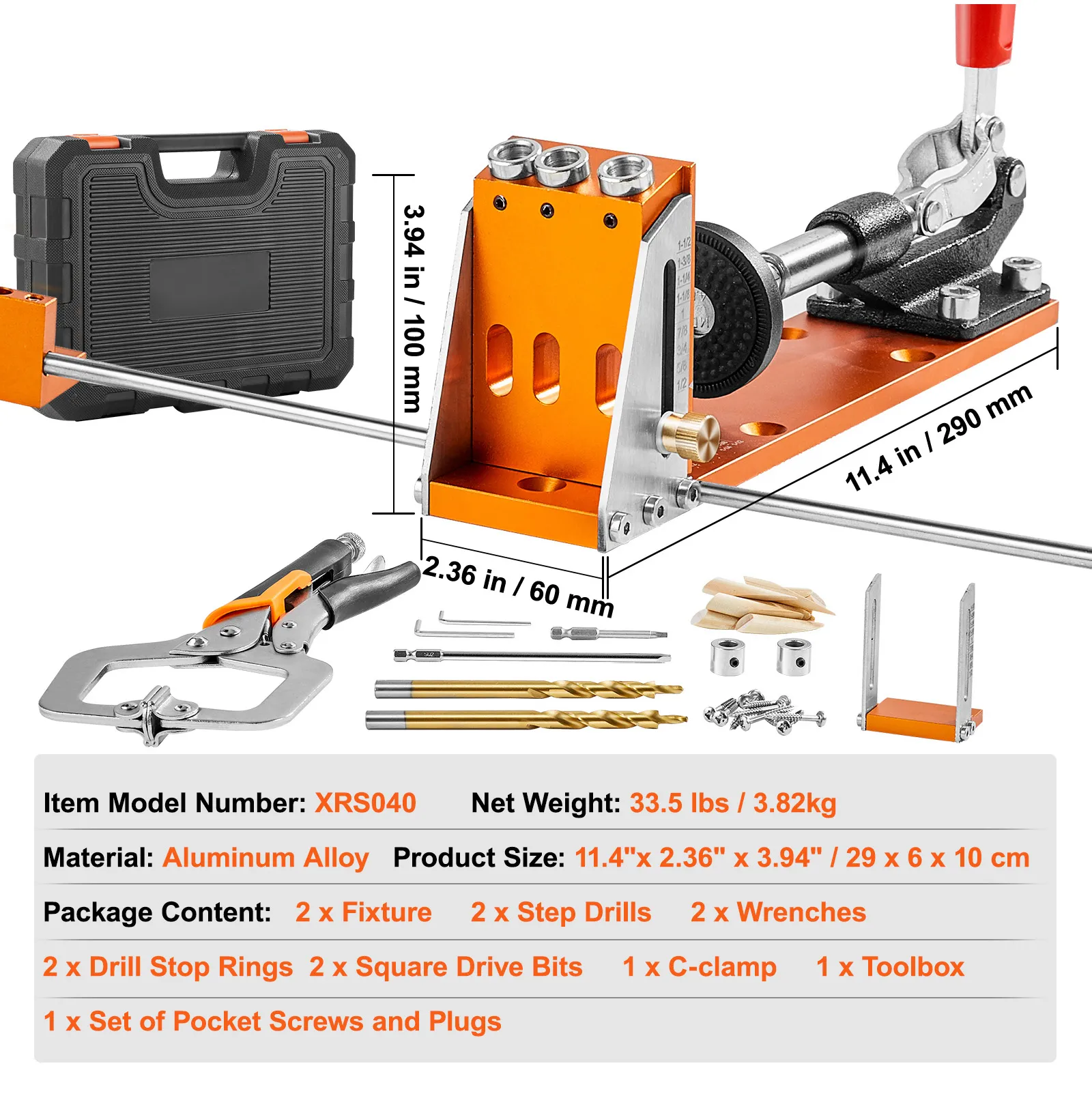 VEVOR Pocket Hole Jig Kit, 34 Pcs Pocket Hole Jig System With 11" C-clamp, Fixture, Step Drills, Wrenches, Drill Stop Rings, Square Drive Bits, Toolbox, Adjustable, For DIY Carpentry Projects