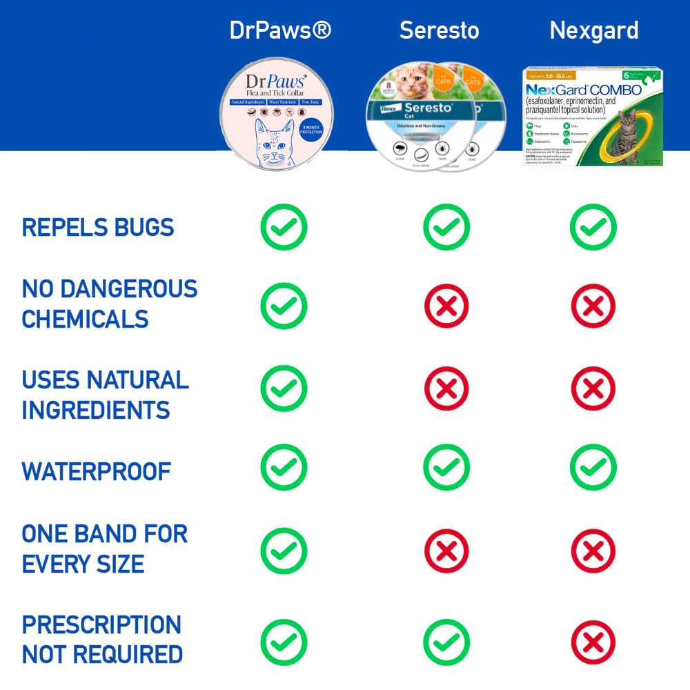 DrPaws® Flea and Tick Free Collar stands out as a natural, chemical-free alternative to conventional pet collars. Suitable for all sizes and waterproof, it offers effective, non-toxic protection without a prescription. Ideal for eco-conscious cat owners, it's a safer, environmentally friendly choice for your pet's well-being.