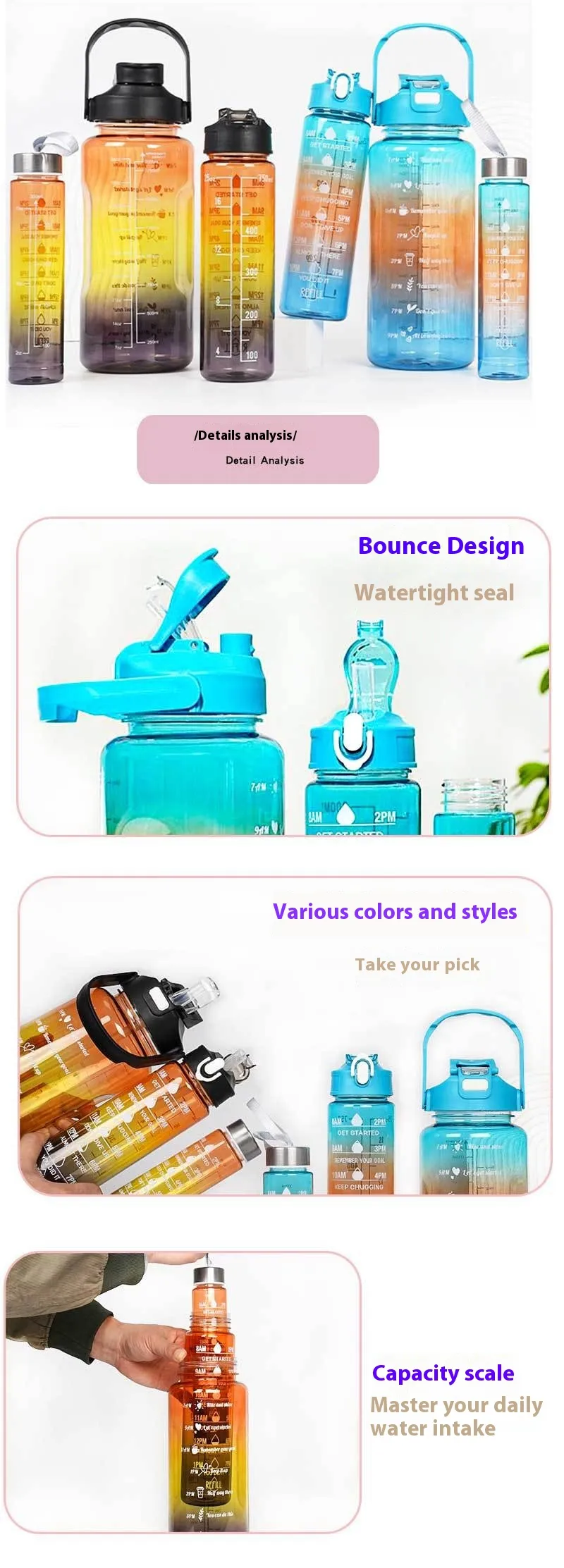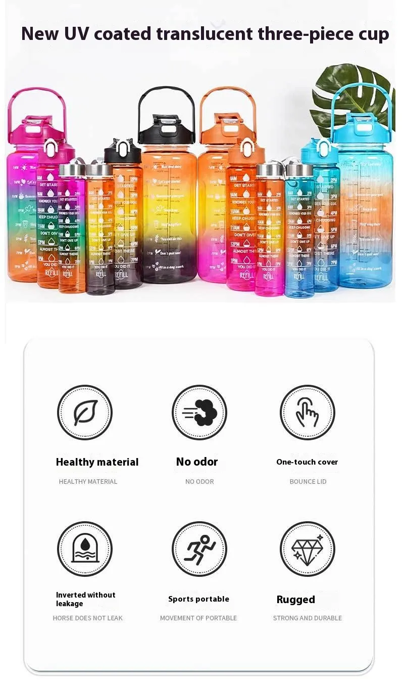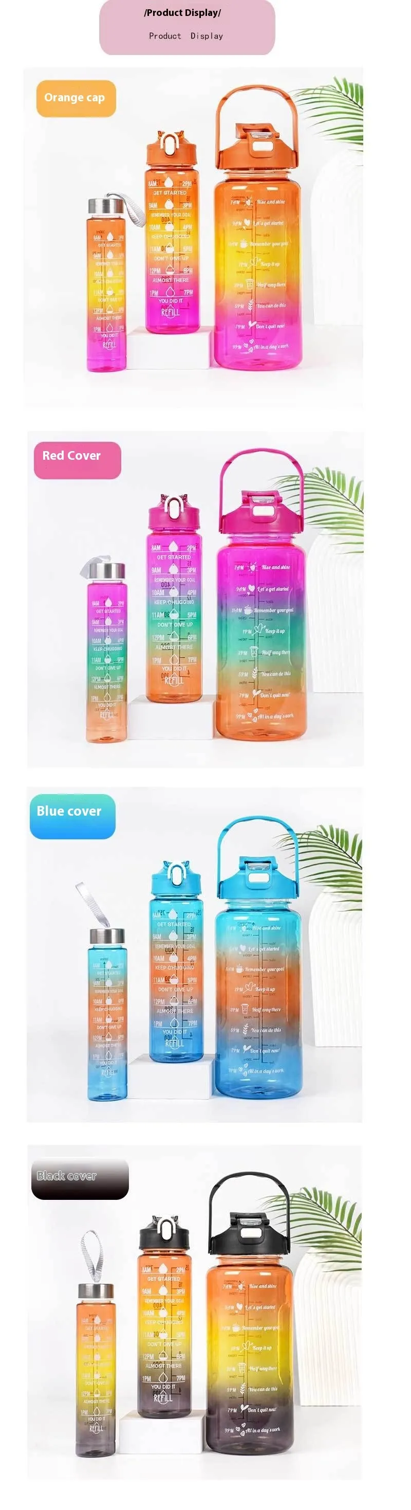 1. Stay hydrated and motivated with this 3-piece Gradient Color Motivational Water Bottles Set, perfect for all your outdoor adventures. Includes 64oz, 32oz, and 15oz bottles with a food-grade straw cup.