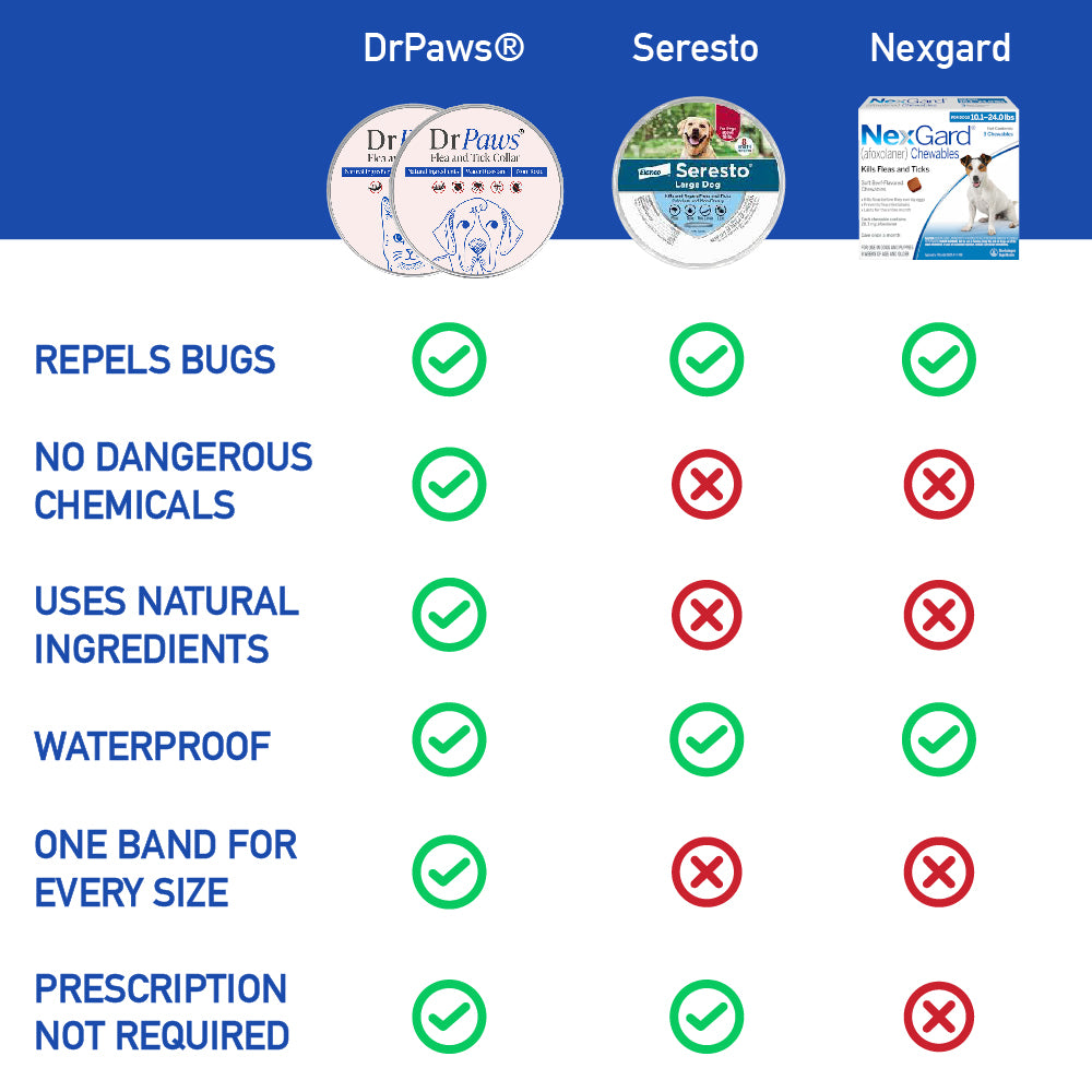 DrPaws® Flea and Tick Free Collar stands out as a natural, chemical-free alternative to conventional pet collars. Suitable for all sizes and waterproof, it offers effective, non-toxic protection without a prescription. Ideal for eco-conscious pet owners, it's a safer, environmentally friendly choice for your pet's well-being.