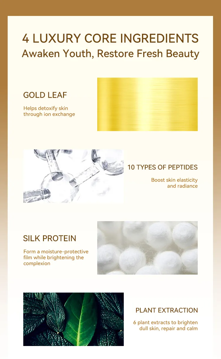 The combination of collagen and 24K gold helps to improve skin firmness, elasticity, and overall skin health.