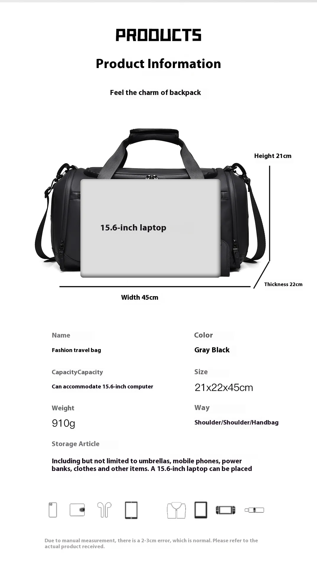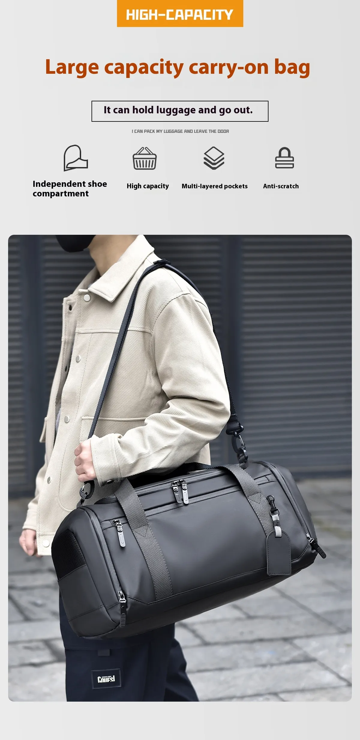 - This large capacity handbag offers ample space to fit all your travel essentials. Whether you’re packing for a short weekend trip or a longer journey, this bag can accommodate a wide range of items. The main compartment is roomy enough to fit clothes, toiletries, and other necessities, while the shoe compartment offers extra space for your footwear.