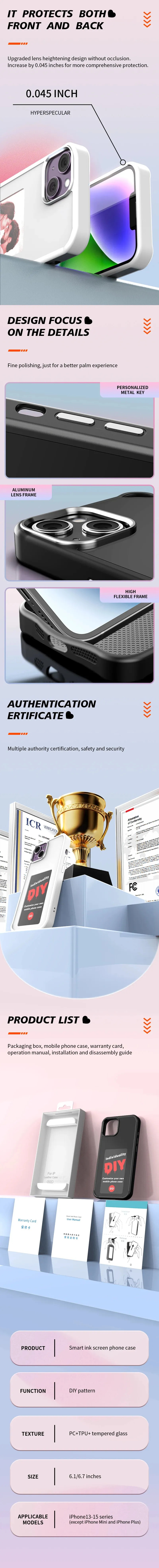 The E-ink Screen Phone Case is a cutting-edge accessory that combines innovative design with luxury and functionality. This personalized phone cover features a dynamic E-ink screen that allows for unlimited screen projection, displaying customizable images, designs, or messages on the back of your phone. With no need for batteries, the case utilizes the energy from your phone, offering a sleek, battery-free solution. Perfect for those who love tech-forward gadgets, this designer phone case not only protects your device but also offers a personal touch with an elegant, futuristic style.