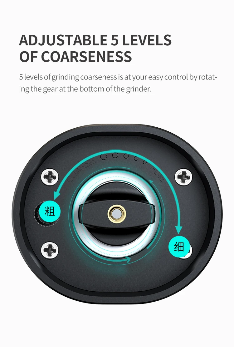 being applied. With adjustable coarseness settings, you can customize the grind size from fine to coarse, making it suitable for various