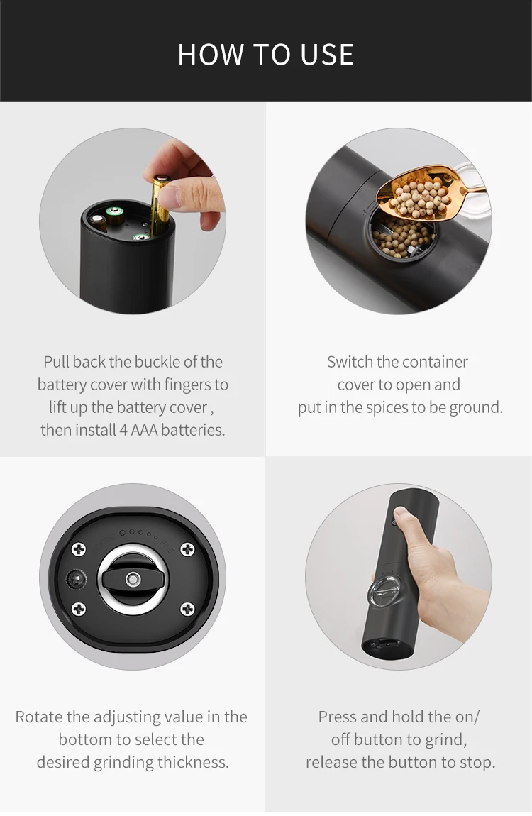 5.Battery Powered: Fill with 4 x AAA batteries as per instructions before use (batteries are not included), which provide strong power for the pepper mill, you don't have to spend a lot of manual grinding.