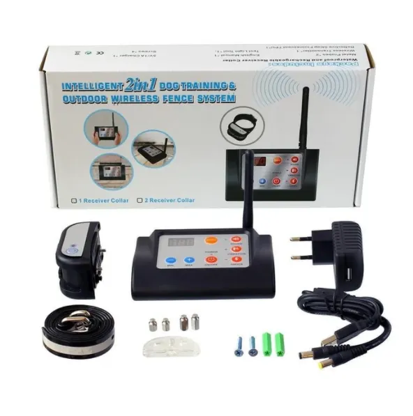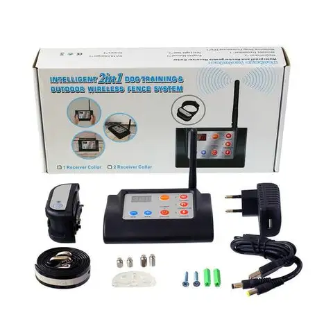 Pet fence system with 2 in 1 function:Â LED display, pet wireless fence and remote control sound vibration shock