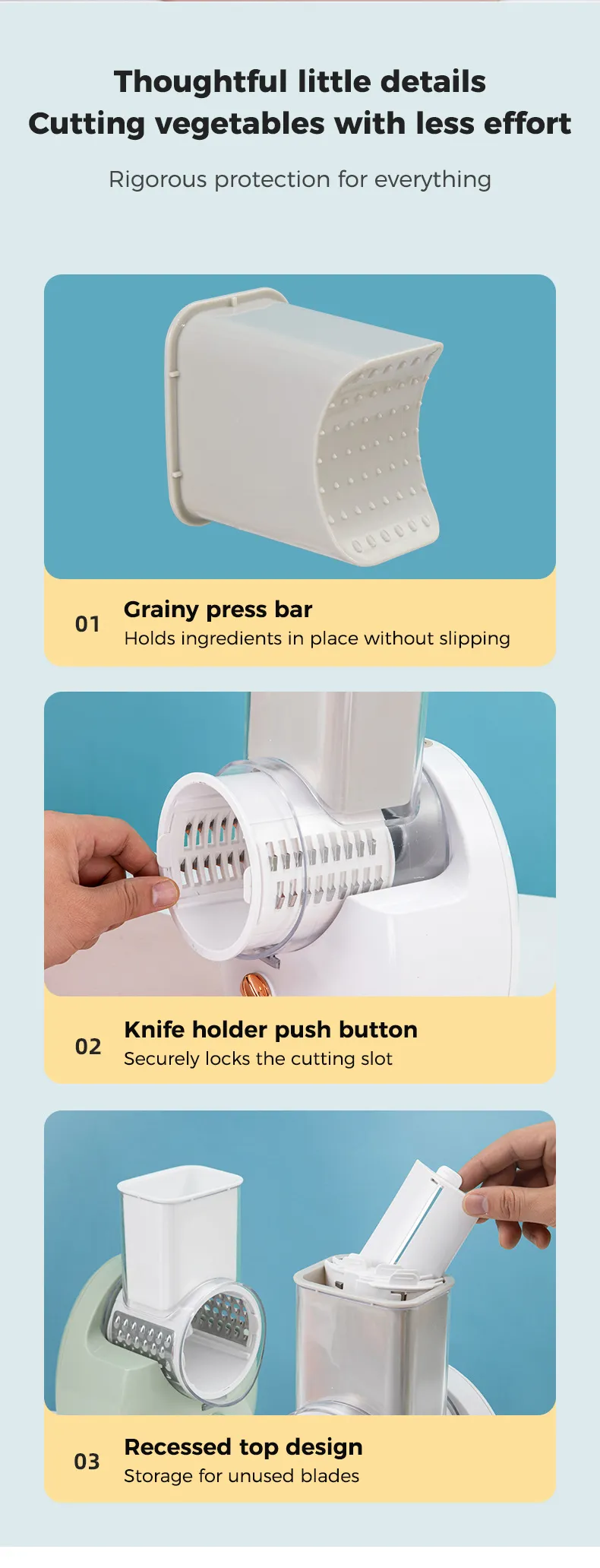 1. Efficient Rotary Grater: One-click automatic cutting for quick preparation and higher efficiency.