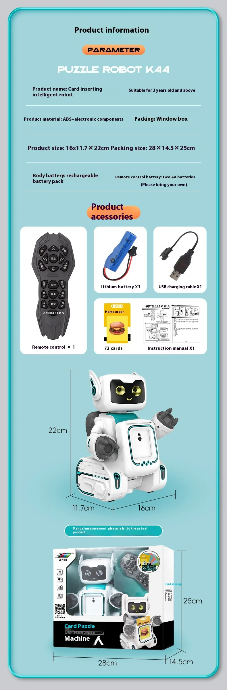 Robot X1 lithium battery X1 USB charging cable X1 remote control X1 card 72 sheets manual X1