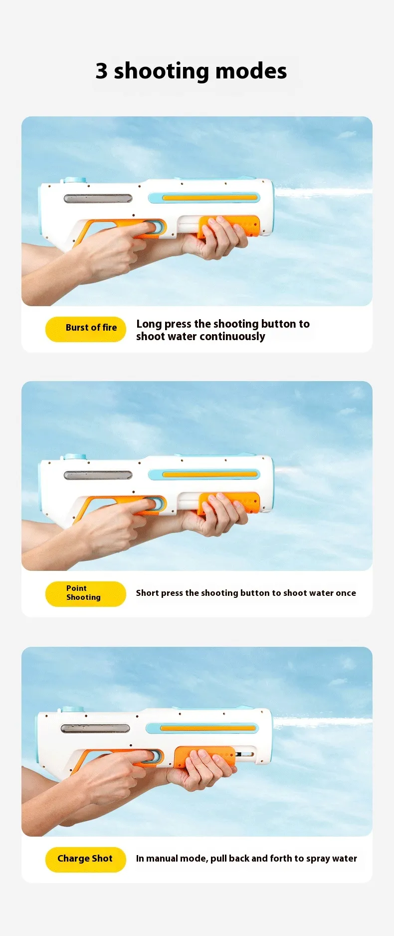 Designed for maximum fun, the Electric Water Gun boasts a long-range, high-pressure stream that can shoot water over impressive distances. Whether you're trying to hit a target from far away or engage in an exciting, high-energy water fight, this water blaster is up to the challenge. Its powerful water stream ensures that you can soak your opponent from a distance, making it ideal for large outdoor spaces.