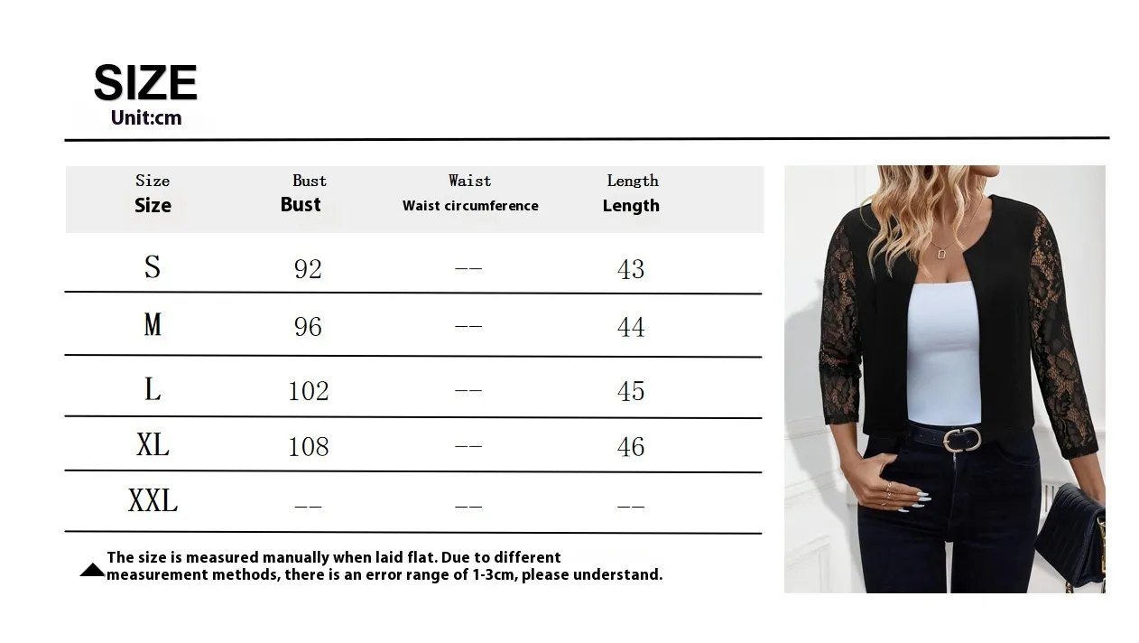 The Elegant Lace See-through 3/4 Sleeve Suit Jacket Small Coat is perfect for women who want to add a touch of elegance and feminine charm to their wardrobe. The lace design provides a delicate, chic look, while the 3/4 sleeve and tailored fit ensure comfort and versatility. Whether you're attending a formal event or want to dress up a casual outfit, this jacket offers the perfect combination of sophistication and style.
