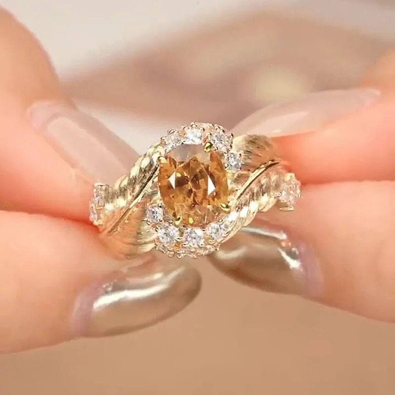 Embossed Feather Ring – Exquisite Female Fashion Ring with Yellow Zircon