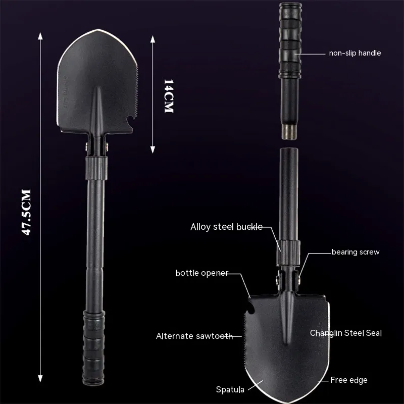 Equip yourself with the Engineering Outdoor Folding Shovel, a versatile tool designed for outdoor enthusiasts, first aid responders, fishing fans, and drivers facing car emergencies or snow-covered roads. This durable, compact, and easy-to-use shovel combines multiple functions, making it a valuable addition to your gear for camping, hiking, and on-the-go situations. With features like a serrated edge for sawing, a sharp spade for digging, and a foldable handle for compact storage, this multifunctional shovel is the ultimate solution for unexpected challenges in outdoor environments.