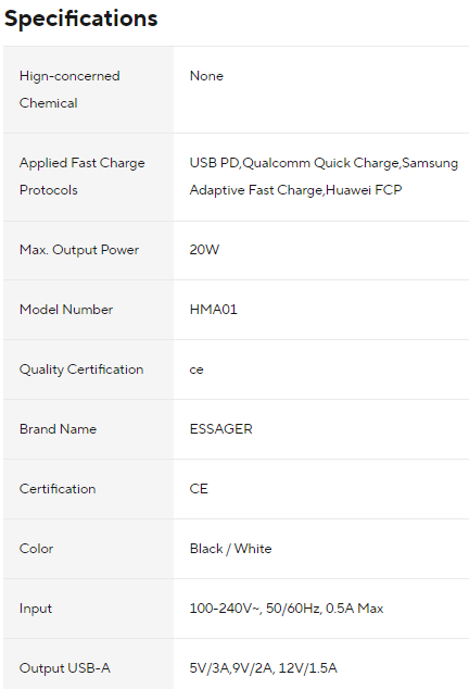 Essager 20W GaN USB Type-C Charger - PD Fast Charge QC 3.0