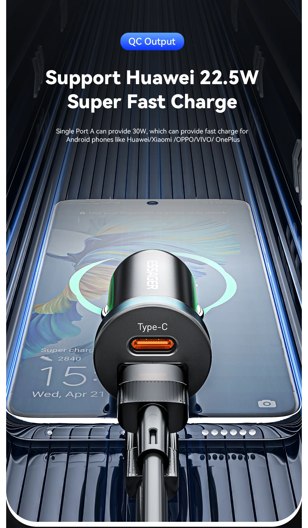 The Essager 30W USB car charger supports Quick Charge 4.0/3.0 and PD for rapid charging. Compatible with Xiaomi, iPhone 12, 13, 14 Pro, and other devices, it ensures fast and efficient charging on the go. Perfect for keeping your phone powered during travel.