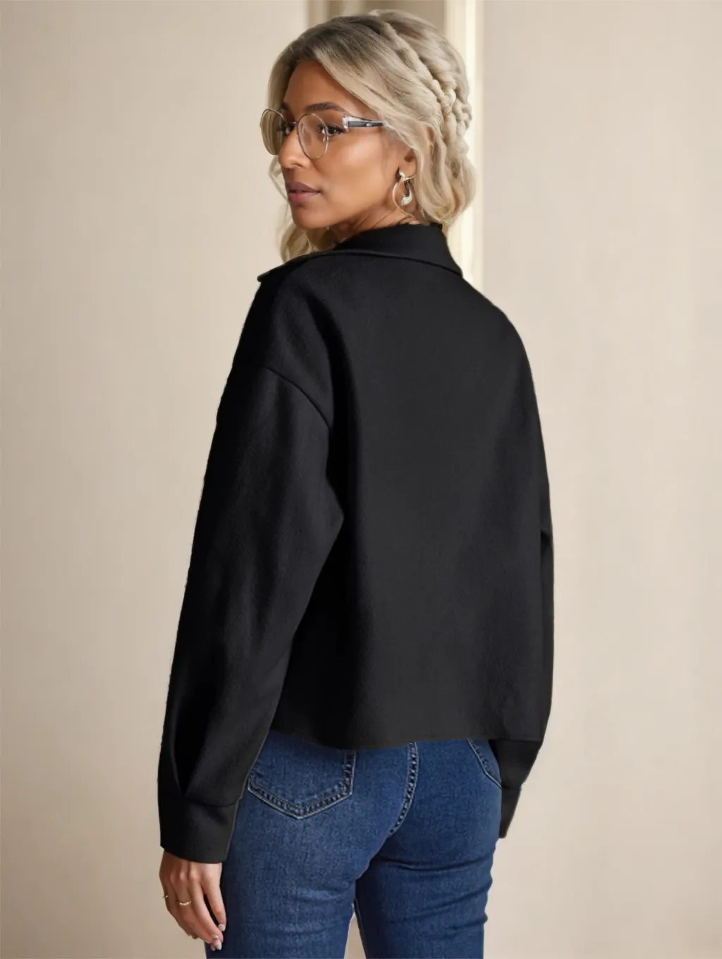 outfits. It complements jeans, trousers, skirts, and dresses, making it a versatile piece for all types of occasions.