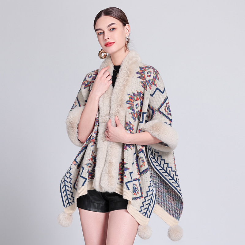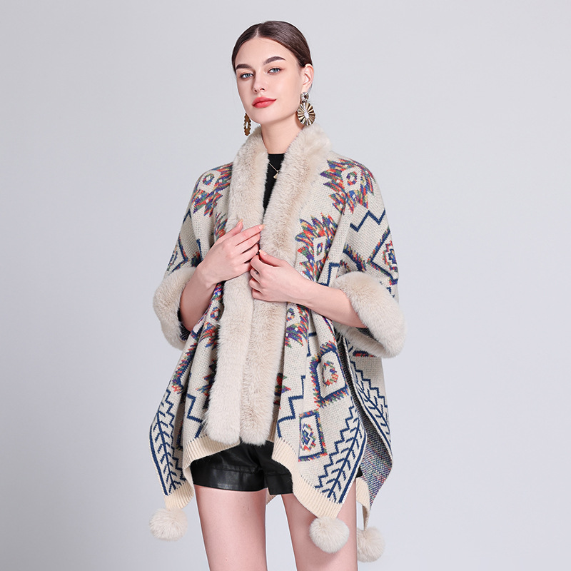 Ethnic Style Fur Ball Shawl Cape Cloak