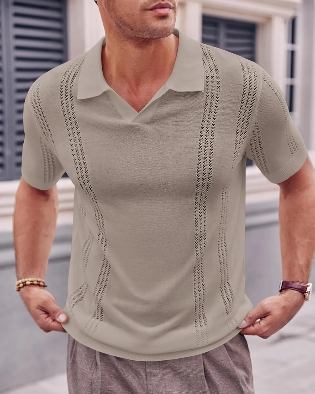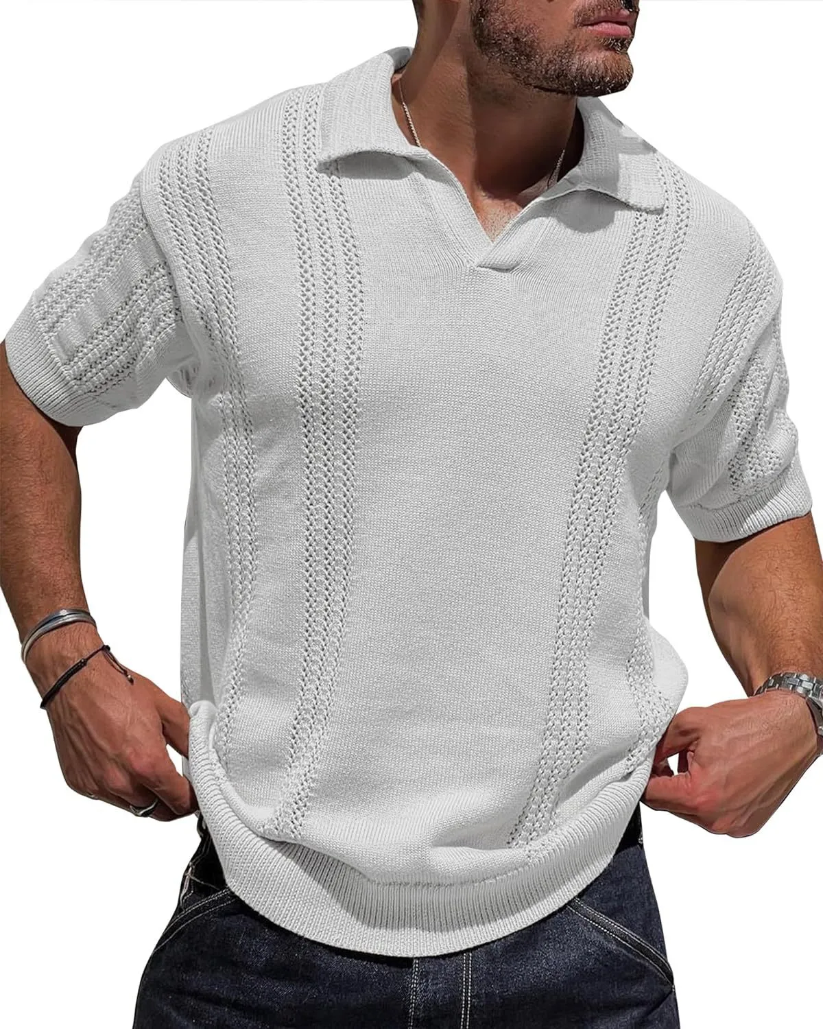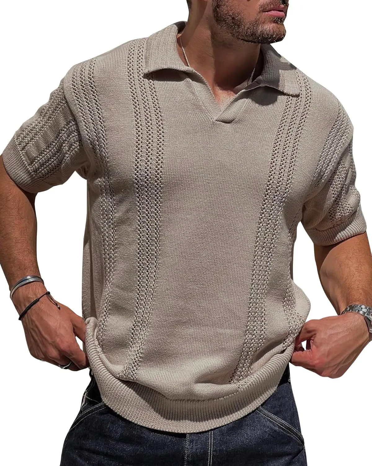 This knitted polo shirt is versatile enough to pair with a variety of outfits. Whether you're dressing up for a night out or keeping it casual during the day, this shirt is the perfect addition to your ensemble. It pairs well with jeans, chinos, or even shorts, making it a go-to choice for fashion-conscious men.