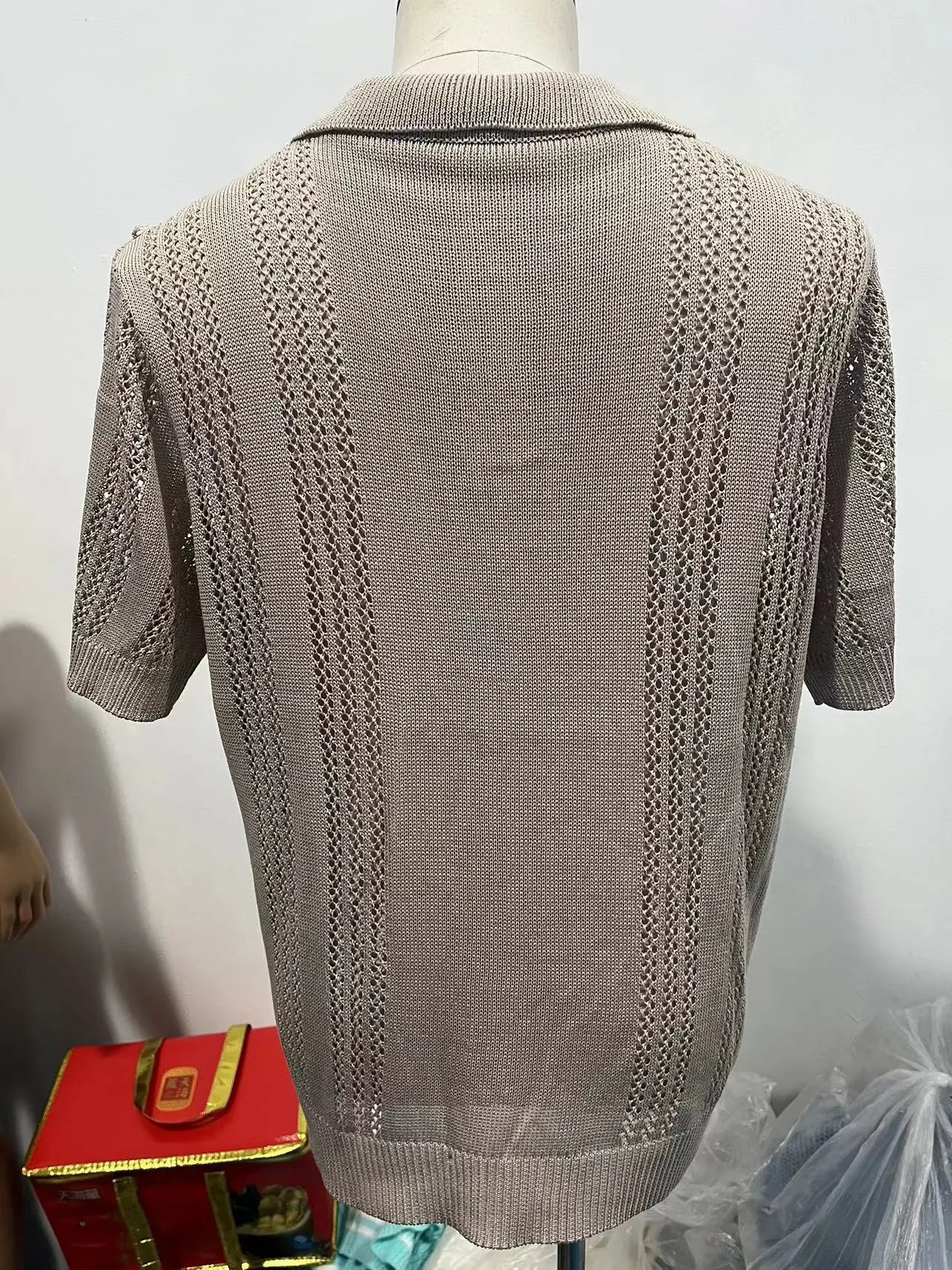 The shirt is designed with a V-neckline that adds a touch of sophistication, while the hollow knit fabric offers a unique texture that stands out in a crowd. The short sleeves are tailored for a comfortable fit, allowing for easy movement without compromising on style. Made from a blend of cotton and synthetic fibers, this polo shirt is soft to the touch, lightweight, and durable, ensuring it remains a staple in your wardrobe for years to come.