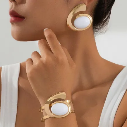 This jewelry suit features exaggerated geometric shapes, including irregular retro circles and unique angular patterns that create a visually striking and modern look. The bold geometric design adds a contemporary twist to your outfit, making it perfect for fashion-forward individuals who love distinctive and statement-making pieces. Whether you’re looking to add some drama to your evening look or just want a standout accessory for everyday wear, these earrings and bangle are designed to impress.