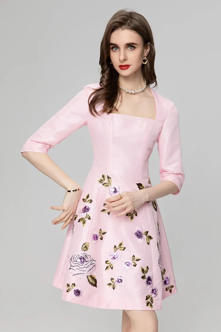 Exquisite Embroidered Flowers Half Sleeve Skirt Dress