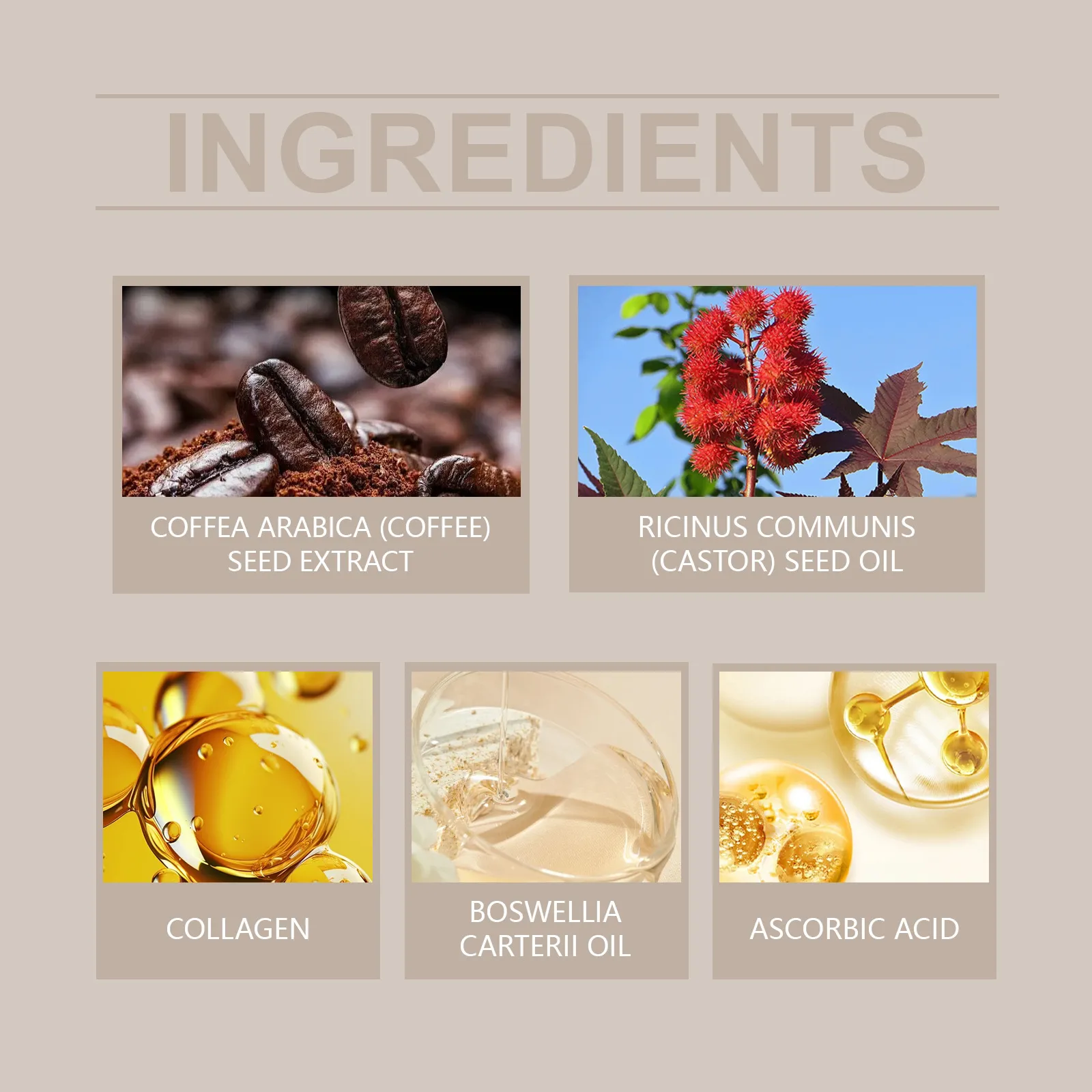 Ingredients: castor oil, frankincense oil, ascorbic acid (vitamin coffee seed extract, collagen