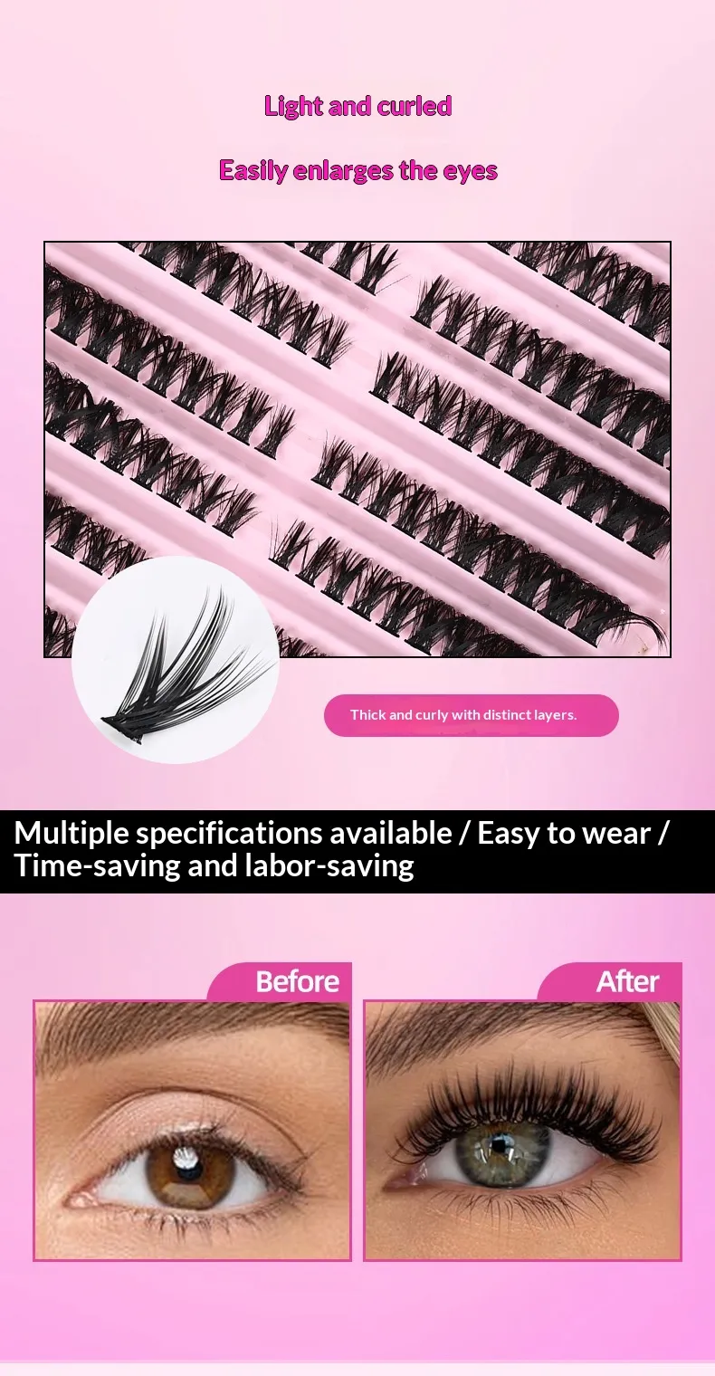 This Eyelash Clusters Kit stands out for its easy application, customizability, and long-lasting wear. Whether you’re new to lashes or an experienced beauty enthusiast, the pre-made clusters make achieving professional‑looking lashes quicker and more convenient. The versatility of layering different lengths and densities allows you to achieve the perfect lash look for any occasion. With the included lash glue and tools, this kit makes it easy to create a beautiful, voluminous effect without the hassle or cost of salon visits.