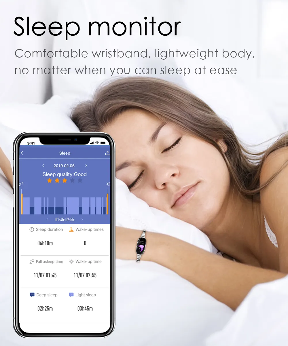 The F18 Smart Bracelet offers a variety of health and fitness features, making it perfect for women who prioritize well-being. The bracelet tracks: