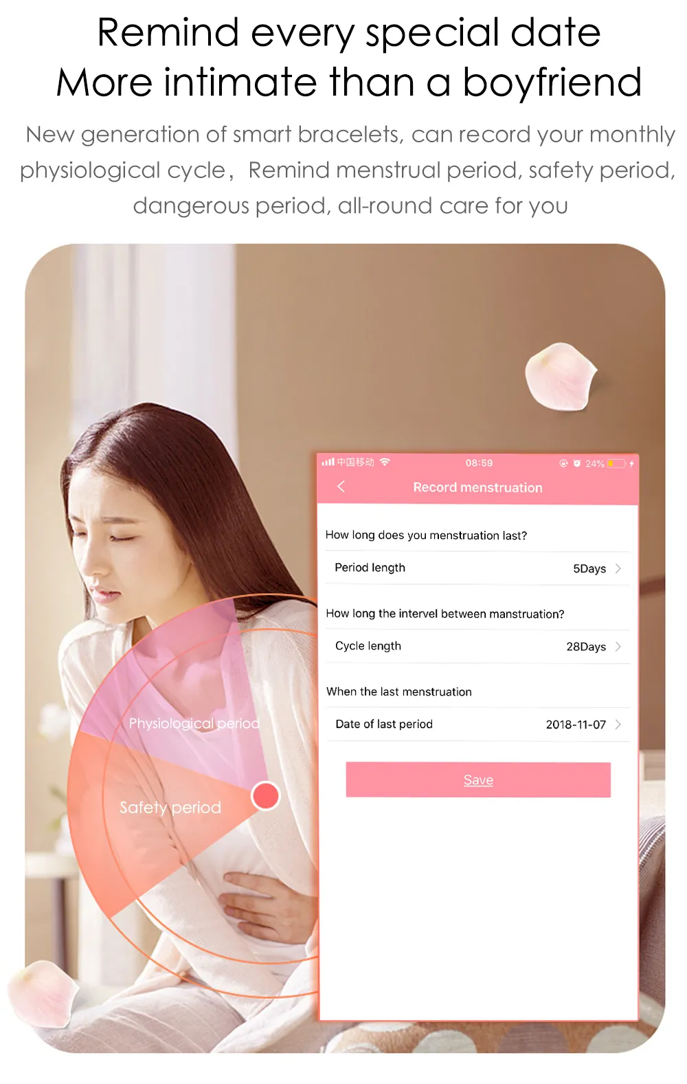 reminder (caller number/name), message reminder, alarm clock reminder, anti-lost reminder, sedentary reminder, female menstrual period
