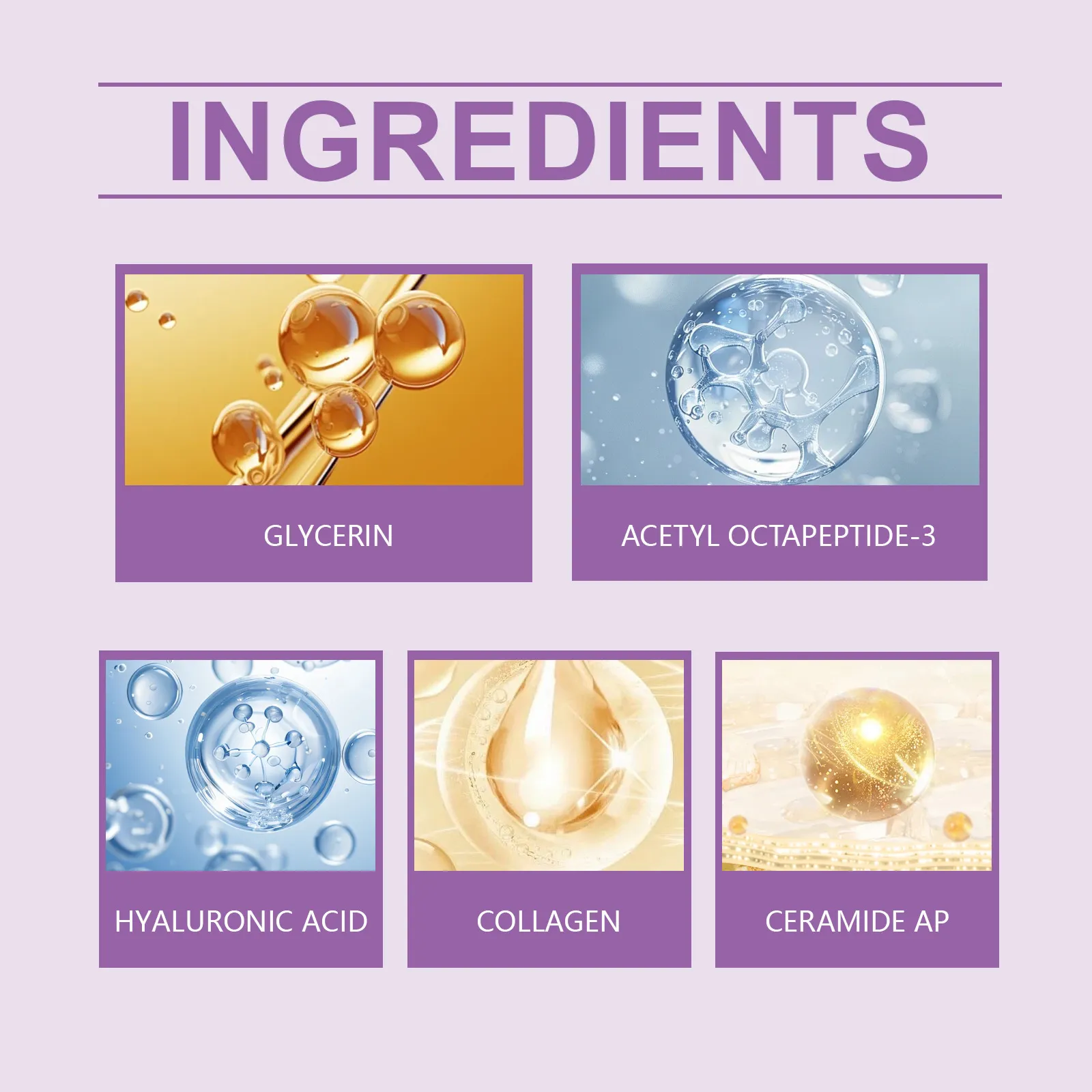 Ingredients: glycerin, hyaluronic acid, collagen, ceramide AP, acetophenetidin-3