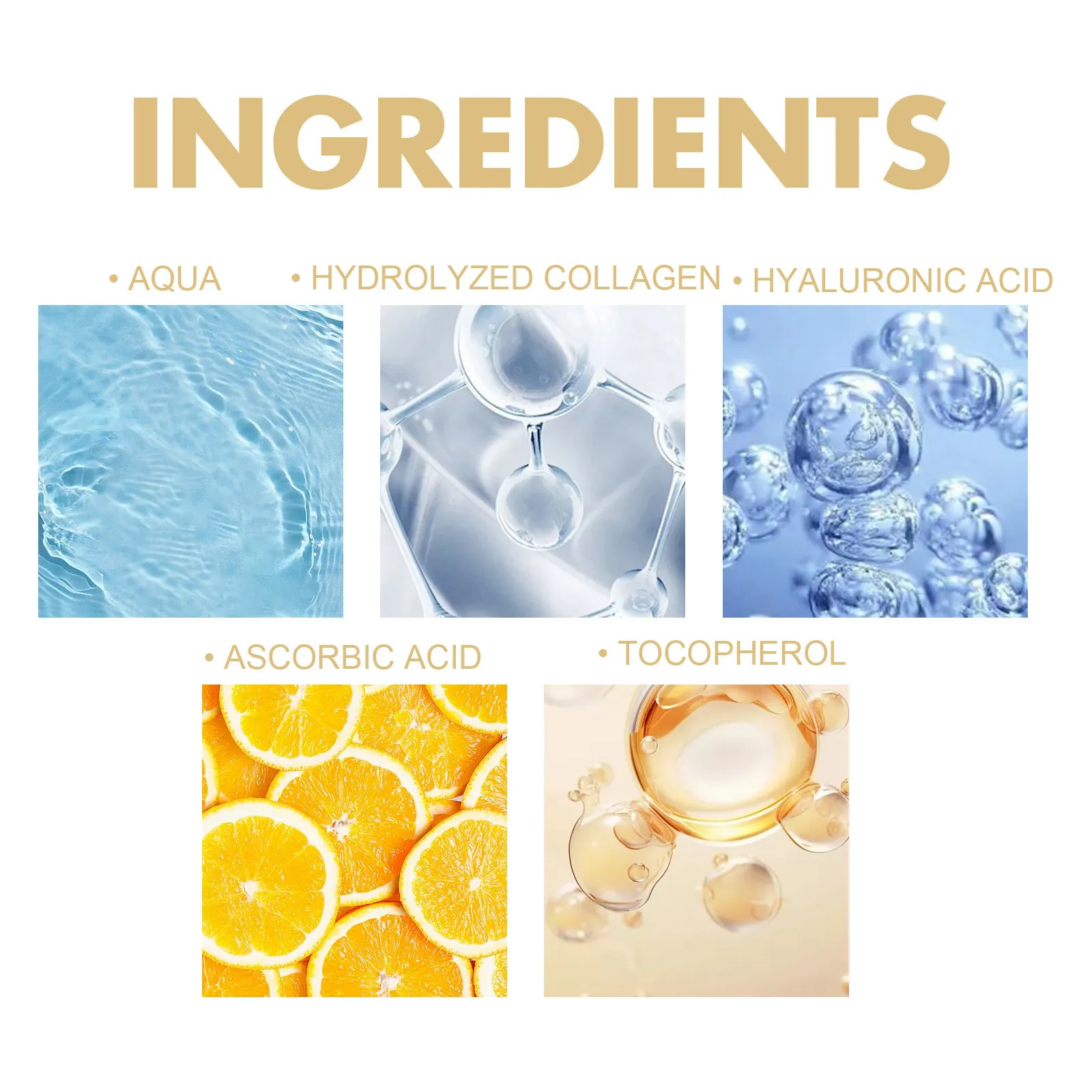 Ingredients: Water, Hydrolyzed collagen, hyaluronic acid, vitamin C, vitamin E
