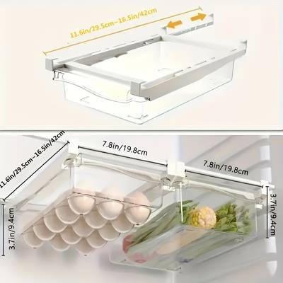 The FARIDABIO 2pcs Refrigerator Hanging Storage Drawer Organizer is designed to maximise fridge space and keep your fruits, vegetables, eggs, and meats neatly stored. Made from durable plastic, this heavy-duty organizer features adjustable shelves and hooks for a customisable storage solution.