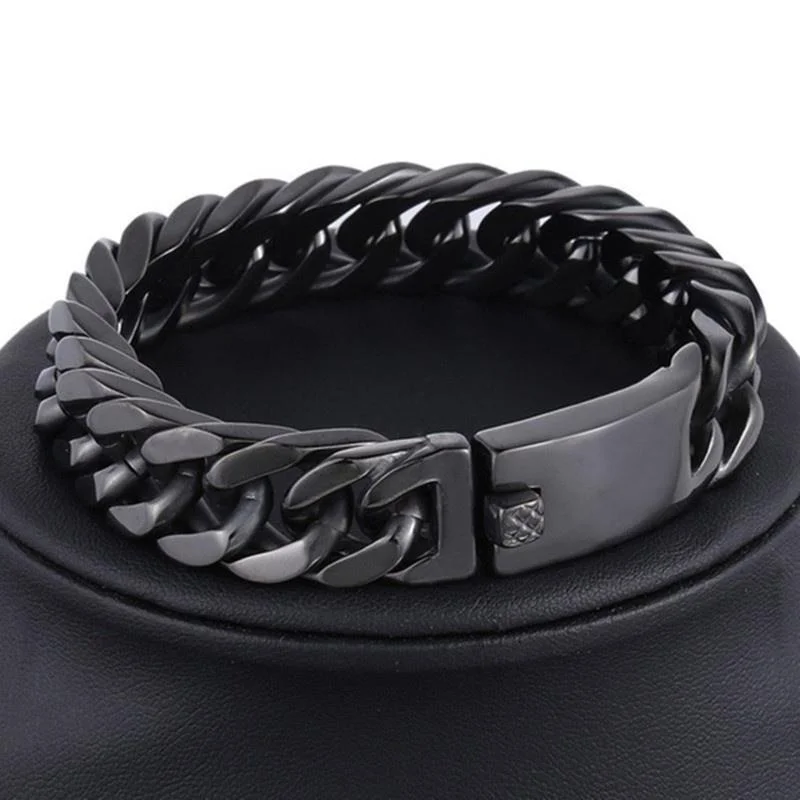 Crafted from high-quality stainless steel, this Cuban chain bracelet is designed to be both stylish and durable. Its polished black finish resists tarnish and fading, ensuring it maintains its bold and elegant look over time. The robust construction makes it ideal for daily wear while remaining lightweight and comfortable on your wrist.