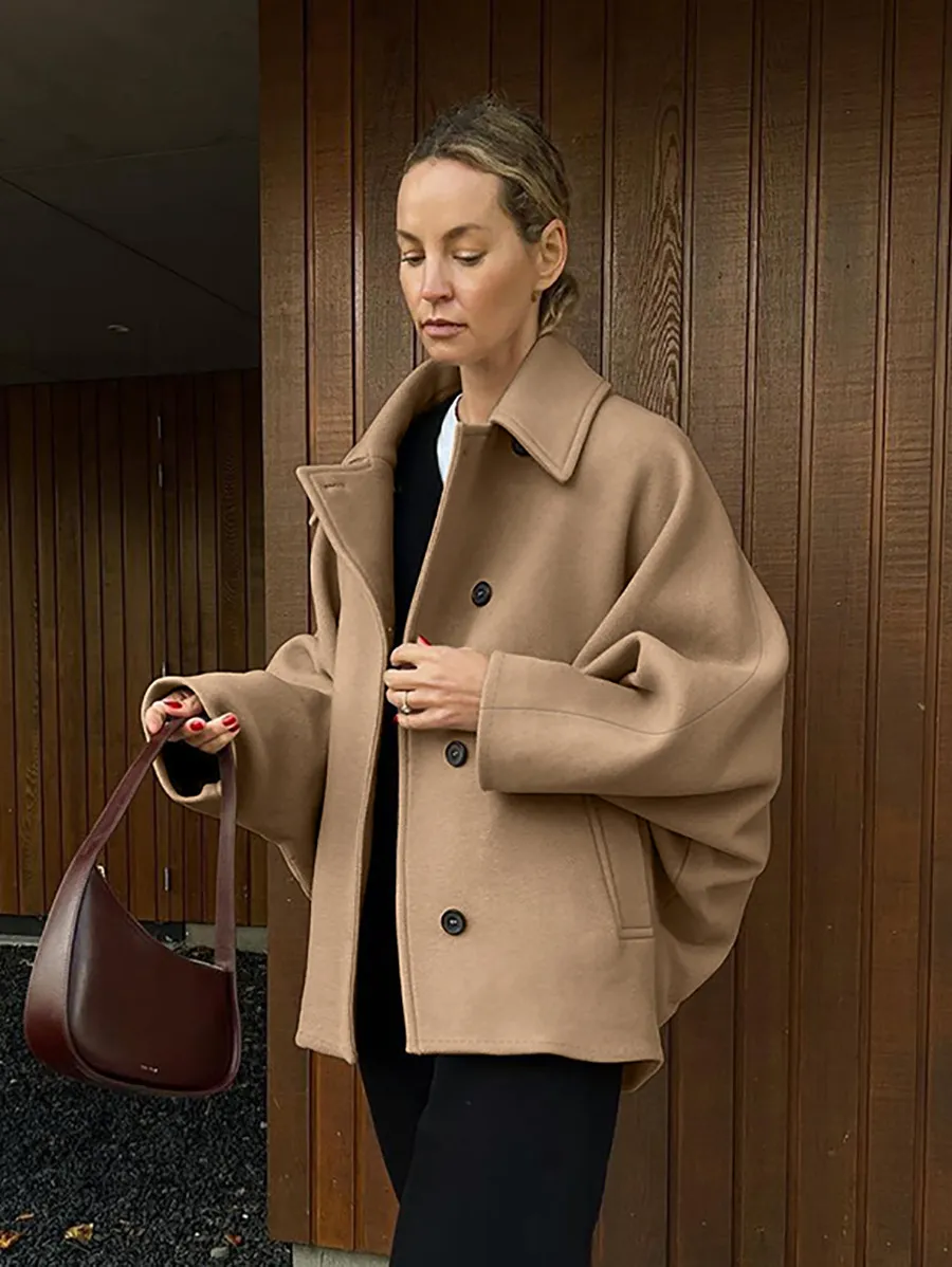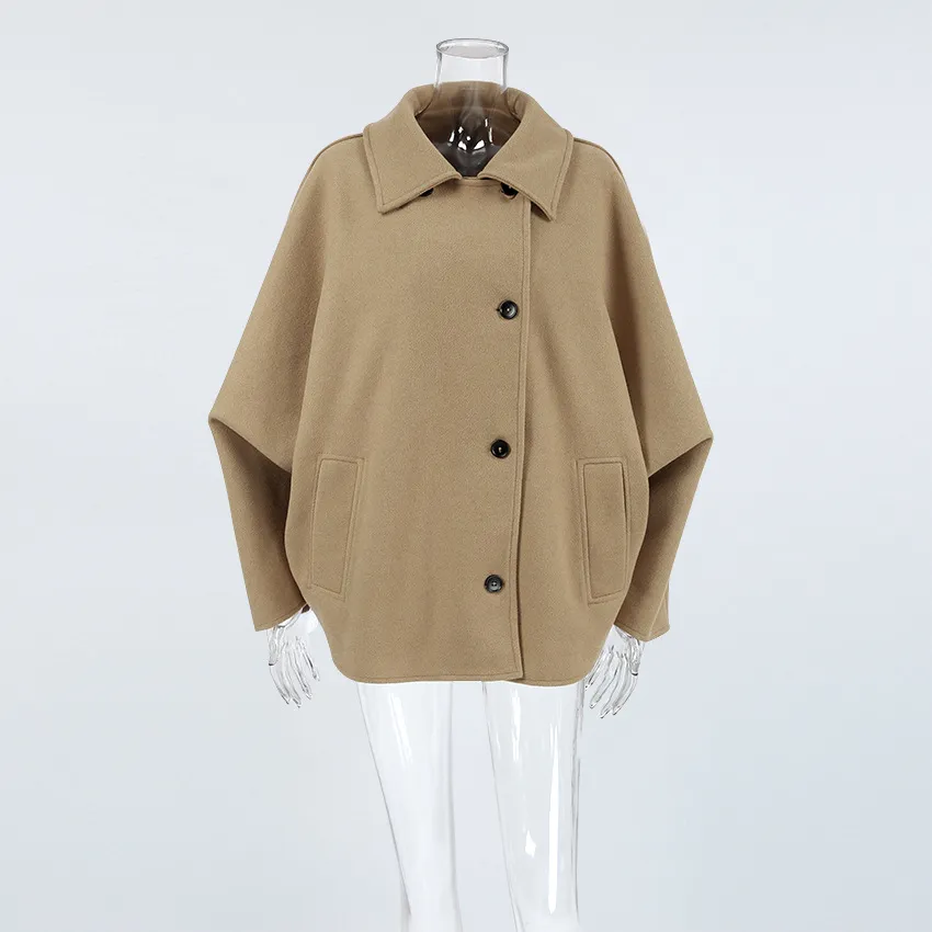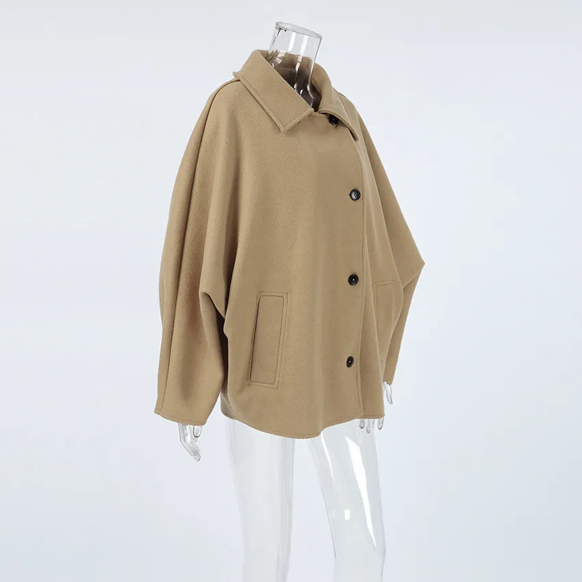 One of the standout features of this coat is the batwing sleeves, which provide an oversized, flowing fit. This design not only adds to the coat's modern appeal but also offers increased comfort and flexibility. The loose sleeves allow for easy movement, making it ideal for daily wear.
