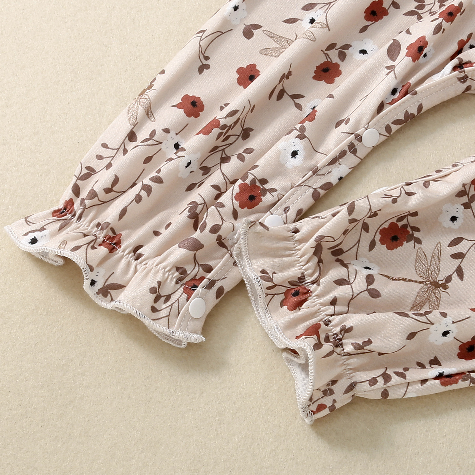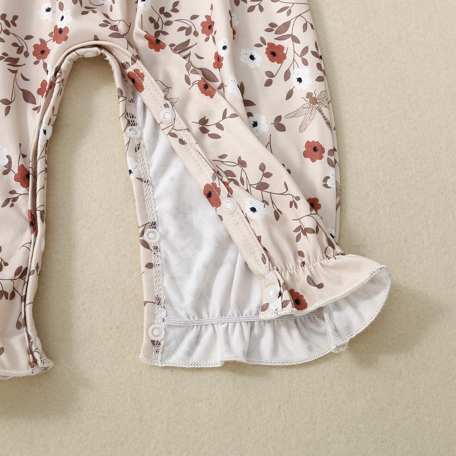 The standout feature of this romper is its vibrant floral print, bringing a fresh, feminine touch to any occasion. The colorful flowers are carefully arranged to create a cheerful and eye-catching design, making it perfect for a sunny day or a special event. The floral pattern adds a playful yet stylish element to the outfit, ensuring your little one stands out in the best way possible.