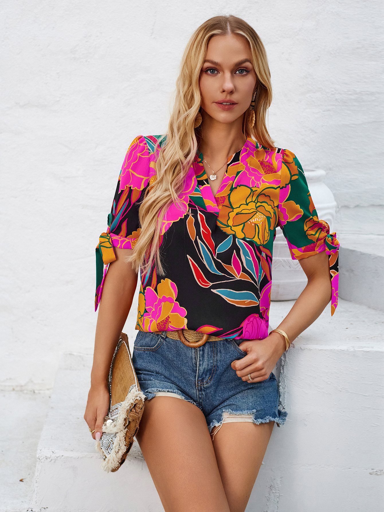 Refresh your casual collection with our Fashion Printed Casual V-Neck Cuff Bundle Top. This trendy top features a fashionable V-neck design