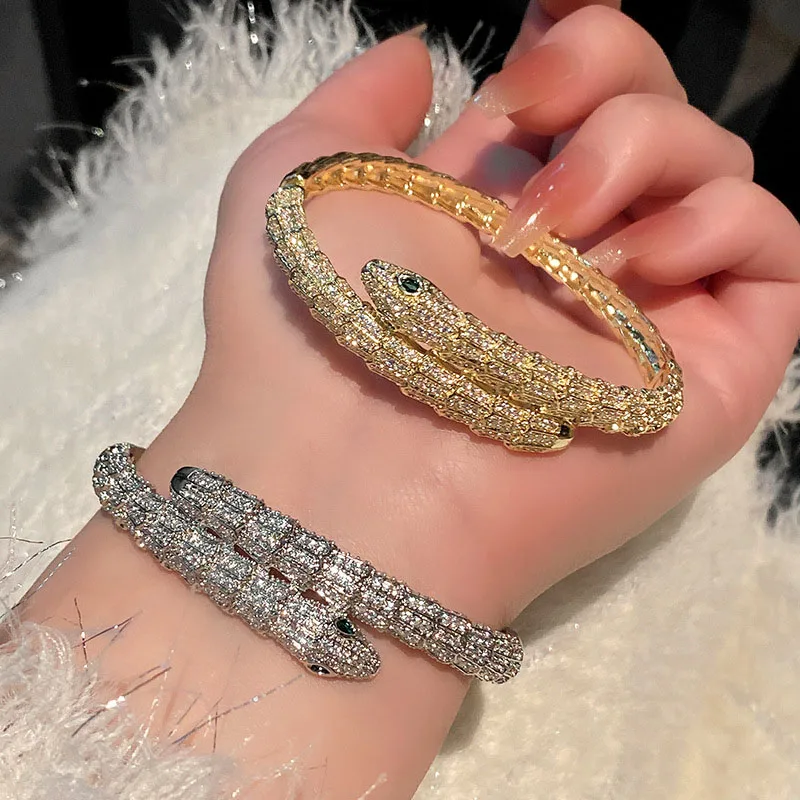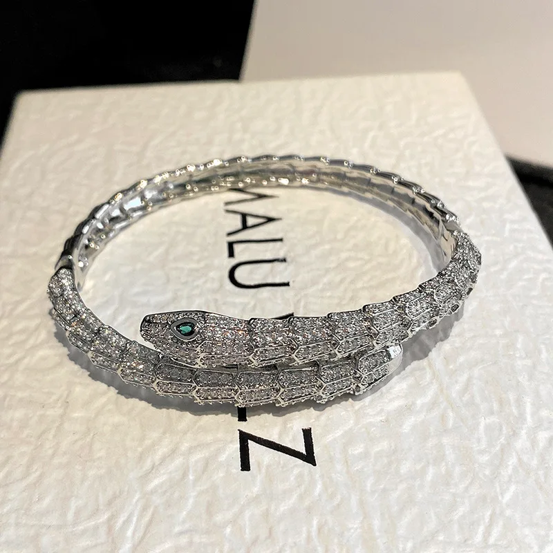 This eye-catching bracelet is designed with intricate craftsmanship, showcasing shimmering zircons that adorn the snake’s body, while vibrant green eyes add a lifelike detail. The adjustable design ensures a comfortable fit for various wrist sizes, making it an ideal accessory for daily wear or special occasions. Whether paired with casual attire or evening wear, this serpentine bangle offers a unique blend of glamour and edge.