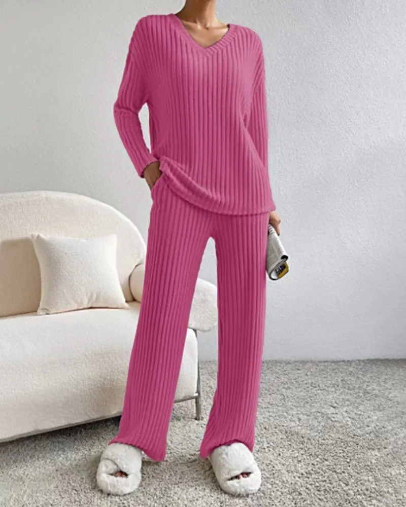 Fashion Solid Striped Suit V-neck Long-sleeved Top And Casual Straight Pants Loose Temperament Women's Clothing
