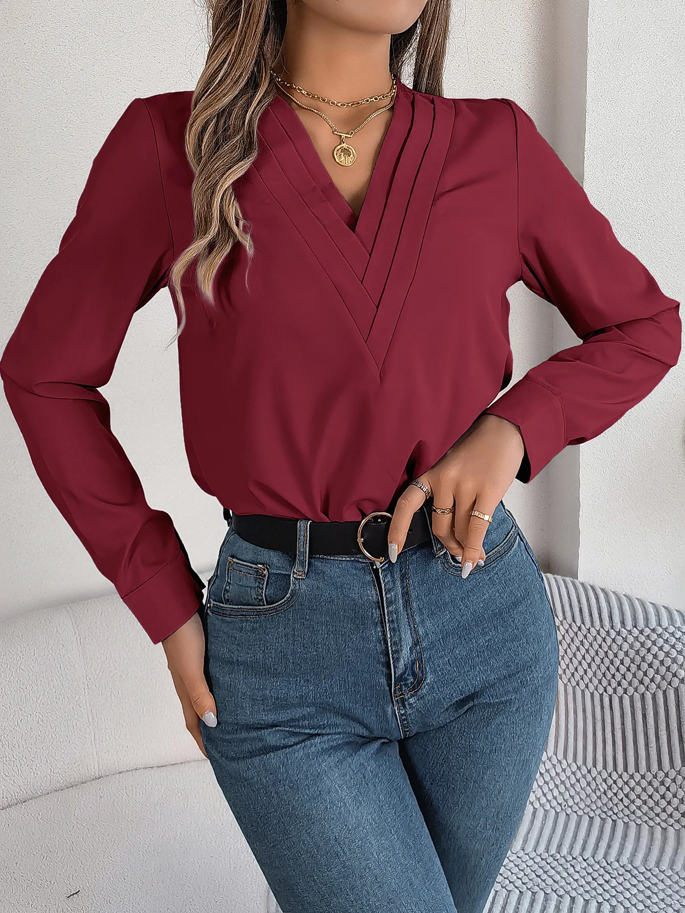 This V-neck blouse is incredibly versatile, making it a valuable addition to any wardrobe. It can easily transition from day to night, allowing you to go from the office to an evening out with minimal effort. Pair it with a blazer for a more formal look, or wear it on its own with a statement necklace for a chic, understated style. The solid color options make it easy to mix and match with your existing wardrobe, providing endless styling possibilities.