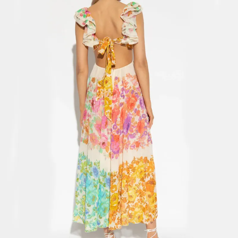 Fashion V-neck Ruffle Sleeve Long Dress Summer Romantic French-Style Flowers Print Bow-knot Backless Design Beach Vacation Dresses Womens Clothing