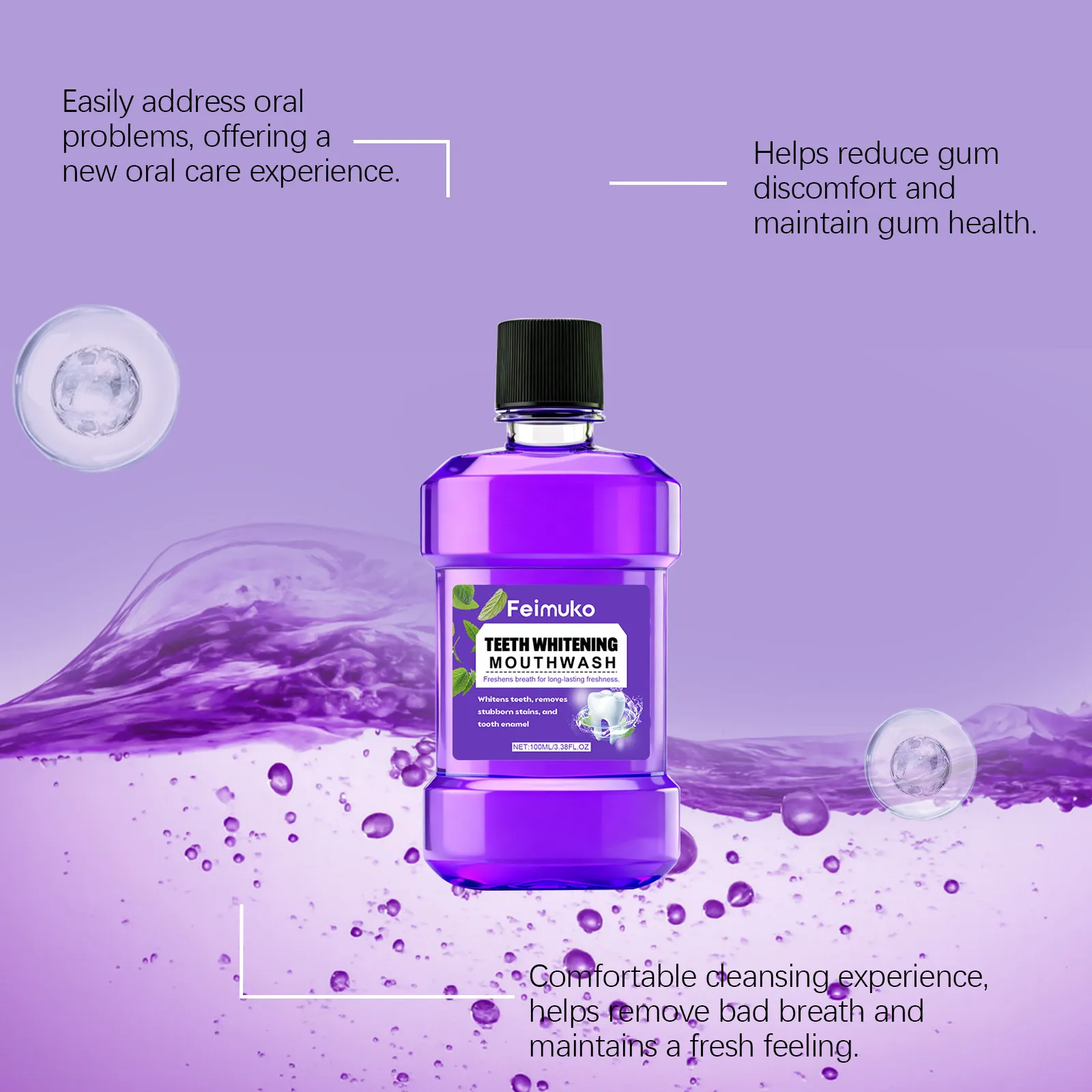 Achieve a brighter smile and fresher breath with Feimuko Teeth Whitening Mouthwash.