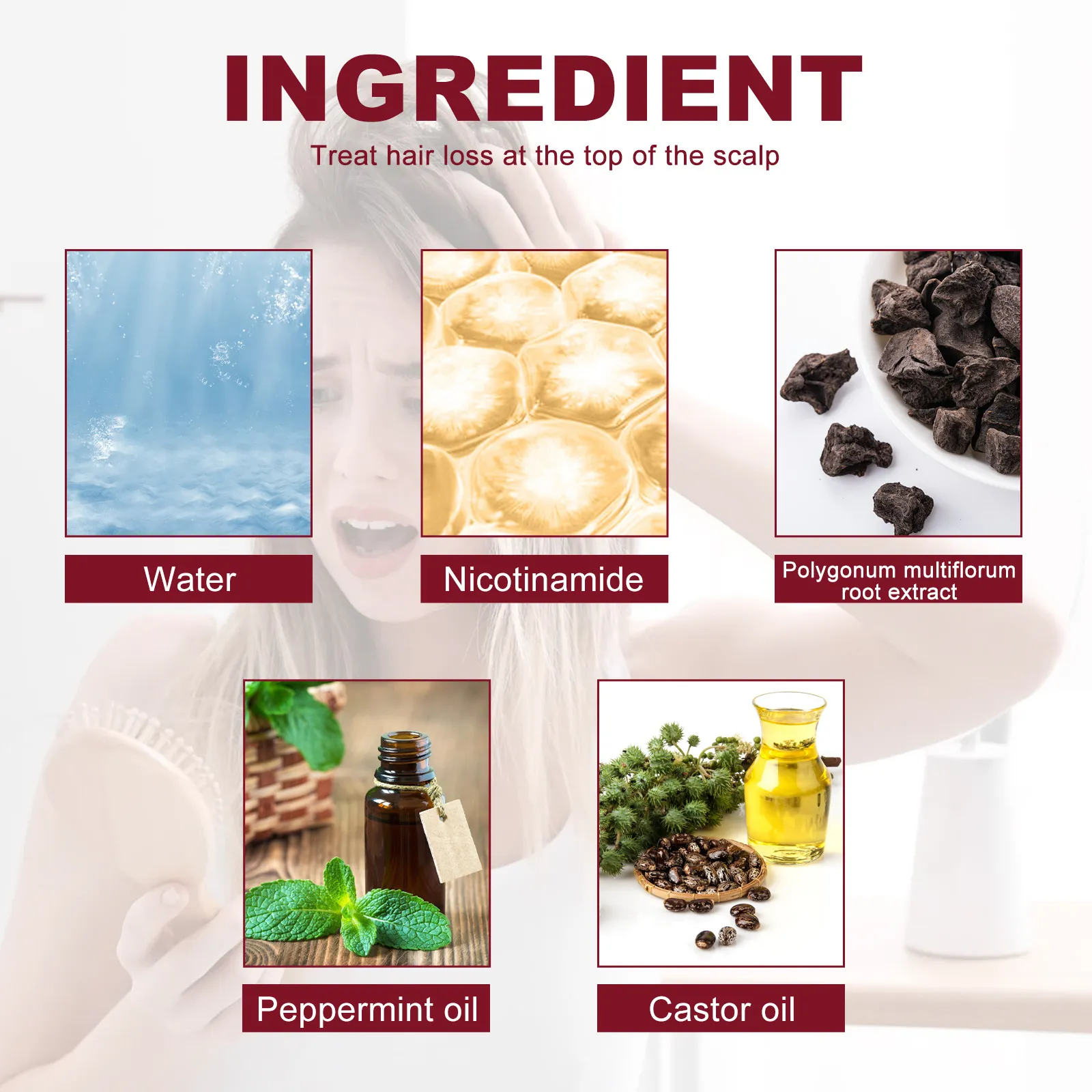 Ingredients: Water, biotin, nicotinamide, Polygonum multiflorum root extract, peppermint oil, castor oil
