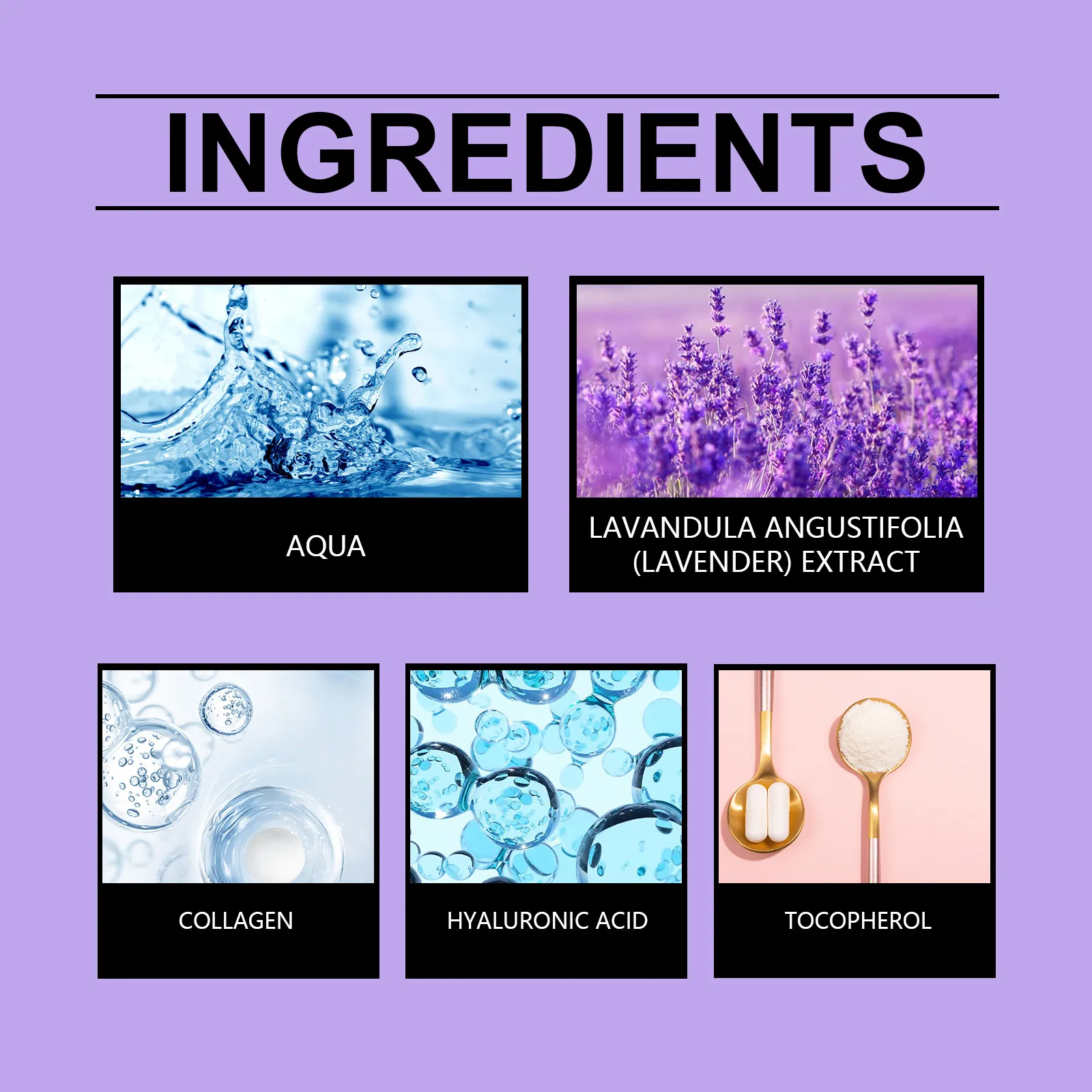 Ingredients: Water, lavender extract, collagen, hyaluronic acid, vitamin E.