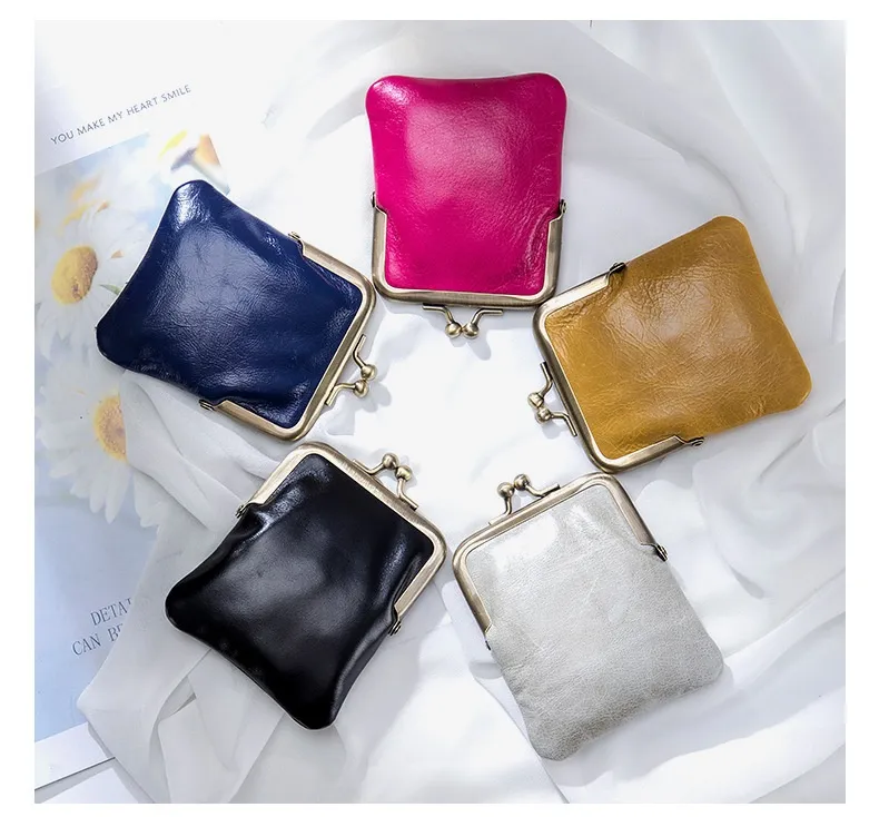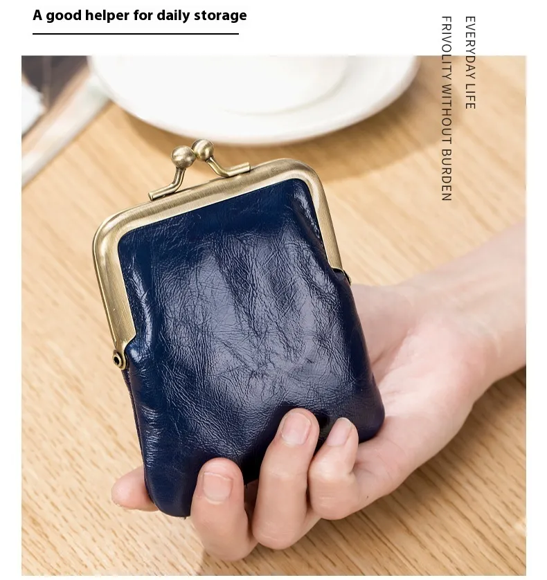 First Layer Oil Wax Cowhide Retro Compact Clip Coin Purse