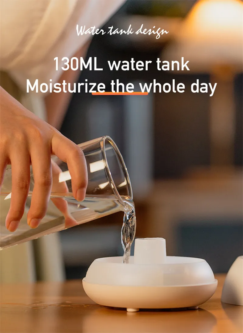 The 130ML water tank provides ultra-fine mist to hydrate dry air, making it ideal for combating dry climates, improving skin hydration, and easing respiratory discomfort.