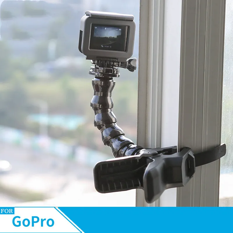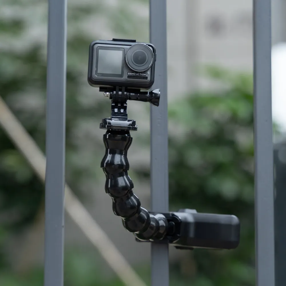 clip the camera directly to a flat surface, or use the optional curved neck for a wider range of camera angle adjustments. The gripper