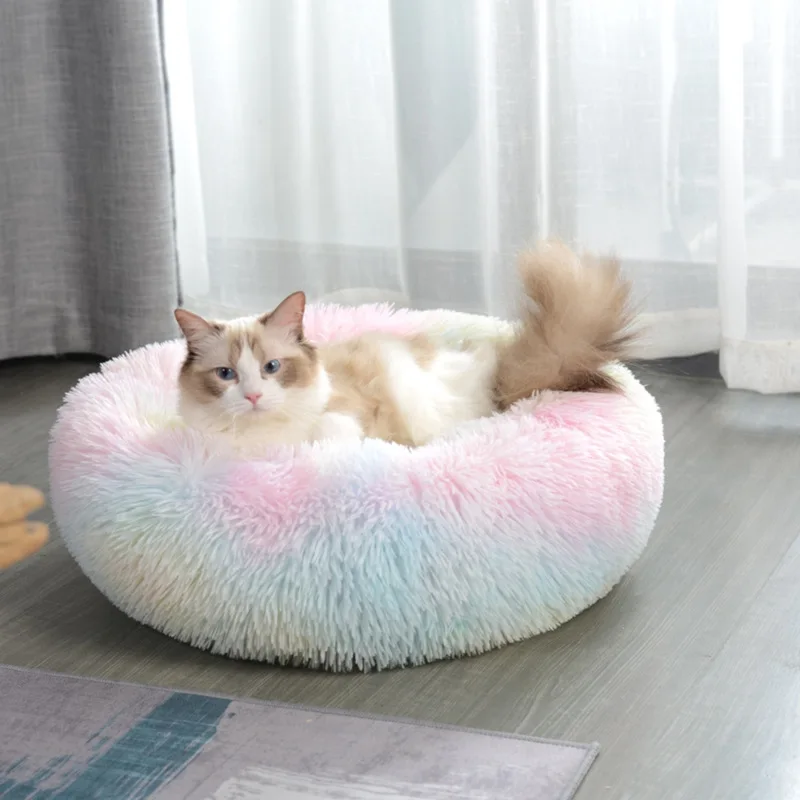 Pets Love To Sleep In It. Easy To Clean And Wash.Soft and Safe: The pet beds are made of cotton, a synthetic solid material explicitly designed to be safe for animals and humans. This donut pet bed also can keep your pet self-warming and comfortable in cold weather.Better Sleep: Our high-quality fluffy bed is ideal for pets who enjoy curling up! The raised rim can bring a sense of security and provide head and neck support, relieving your pet's anxiety, easing the transition to a new environment. Round pet beds provide more comfortable deep sleep and let pets feel more secure and surrounded by their love.Reduce Pet Anxiety: Like any curling position, providing head and neck support, the soft texture allows both dogs and cats to relieve any anxiety, also allowing you to feel less anxious and keep your best friend feeling comfy and quiet.Convenient: The non-slip pet donut bed is surrounded by soft fabric, fluffy and soft to the touch. Putting in your carpet, couches, sofas, chairs, beds, floors, and cars are convenient.
